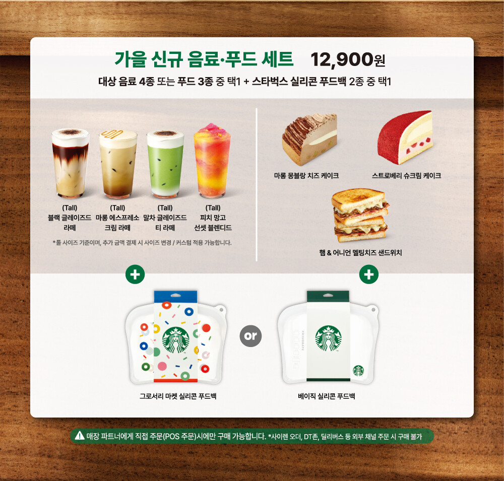 가격은 12,900원이며, 가을 신메뉴(음료 4종·푸드 3종)와 세트로만 구매 가능합니다. 사이렌 오더, 드라이브 스루, 딜리버리 주문은 불가하고 반드시 매장 카운터에서 직접 주문해야 합니다. 9월 19일부터 판매가 시작됐으며 재고 소진 시 종료라 매장 방문 전 전화 확인이 필수입니다.